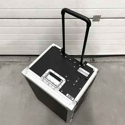 Plastikust metall raamiga, ratastega laadimiskast lukustava kaanega.